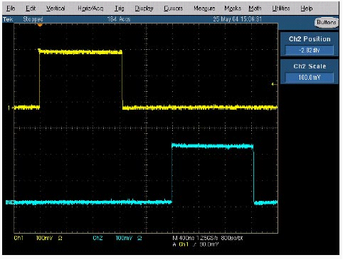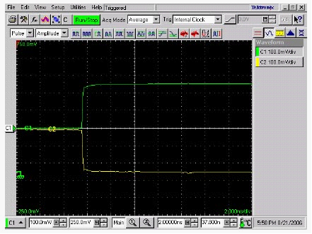 但若用一台实时示波器来观测这两个阶跃脉冲,则可看到如图9所示的波形,可看出两个阶跃脉冲间的真实实时关系中存在着2us的时间差,即这两个阶跃讯号并不是差分讯号。