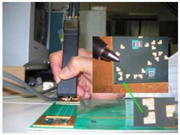 图11是一个频宽达18GHz的差分TDR探棒在进行差分TDR测试时的情况。它的探针间距可在0.5mm~4.5mm间连续可调,即使在测试一个比圆珠笔尖还微小的测试点时,仍能让设计人员以单手完成作业。