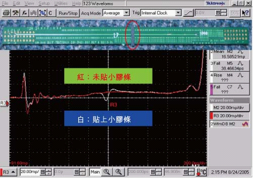 由于探棒频宽达18GHz,因此可获得很高的测试分辨率,图12是对coupon差分走线进行测试时获得的结果。红色波形是对coupon最初的测试结果,随后在走在线贴上了一个很小的胶条(红色圆圈所示部位)然后再进行测试,获得了如白色波形的测试结果,显示出仅贴上小胶条所带来的微小阻抗不连续也能透过高频宽差分TDR探棒清晰地反映出来。